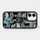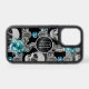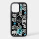 Gray skulls and teal blue flowers are the feature on this phone case. At the center is a round banner lined in matching silver, with your monogram also in silver. A curl of silver stardust is laid over the top half of the design. Unique!