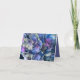 Blue hydrangeas sympathy card with scripture and custom message. Folded cards are covered in a background of hydrangea petals in blue, purple and green. The floral design is also the background for wording inside. "Thinking of you" text on the front in white, with a sample sympathy message inside bottom. A sample scripture from the book of Isaiah is printed on the inside top, in white over purple. Scripture is, "So do not fear for I am with you; do not be dismayed, for I am your God. I will strengthen you and help you; I will uphold you with my righteous right hand."