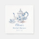 Tea Party themed wedding shower product features a blue floral teapot and cup. Personalize with your information or click "Click to customize further" to edit font styles, size and colors.