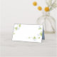 Pretty wedding folded place card done in white, with graphics of delicate leafy green vines with blue little flowers. The inside of the tent style card is done in a light blue. Personalize by hand, for each person at your reception.
