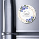 Wedding magnet. The design features an elegant faux gold glitter geometric frame pattern. Overlaid with watercolor blue roses and greenery foliage on two corners. Personalize this template to add your information. Click to customize further to make more changes. Everything is customizable.
