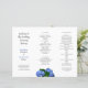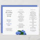 Tri-fold wedding program with dark gray text and a blue hydrangea flower design. Fold into thirds after purchase to create three pages with title, names, date and location of service on front. First names of the bride and groom stand out in pretty blue, printed lettering. The middle section contains the ceremony information with the right hand side for listing the wedding party, personal note to guests, in memory of, or anything you wish. Bright blue flowers with green leaves image at bottom of center panel. Background is white and reverse is solid blue.