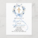 An elegant white background, decorated with watercolored blue flowers in a wreath, a blue bow and a golden cross. Personalize and add a name and details.