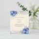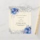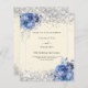 A cream colored background decorated with blue roses, flowers and faux silver confetti. Personalize and add your names and wedding details. Black letters.