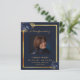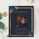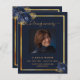 An elegant 2-page program. A dark blue background, a faux gold frame, blue florals and space for a photo. Personalize and add name, dates and your text.