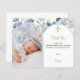 Add a vertical size photo. A blue arch shaped photo frame. Decorated with blue flowers. A white background color. Personalize and add a name and details.