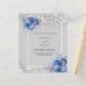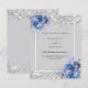 A gray background decorated with blue roses, flowers and faux silver confetti. Personalize and add your names and wedding details. Black letters.