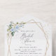 Invite friends and family in style and set the tone for your special day with this charming bridal shower invitation. Design features blue and white watercolor flowers, greenery, gold confetti and gold frame on white background.