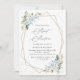 Invite friends and family in style and set the tone for your special day with this charming birthday invitation. Design features blue and white watercolor flowers, greenery, gold confetti and gold frame on white background.
