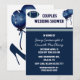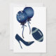Fun couples wedding shower invitation done in navy blue and white. Graphics of two blue balloons and a dark blue, gray, and white football decorates the top of the invitation, with dark blue text reading Couples Wedding Shower. A navy blue text area has white text ready to personalize for your wedding event. The back has a blue stiletto high heel, blue football, and two blue balloons. Great looking football fans shower invitation the groom and bride will cherish.