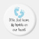 Blue baby footprints design with black text that reads "Little feet leave big imprints on our heart!" on new baby boy or future baby boy T-shirts, mugs, mousepads, tote bags, buttons, keychains, and more!
