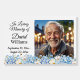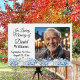 An elegant funeral memorial celebration of life sign with greenery and watercolor blue Forget me Not Flowers with 1 special photo.