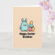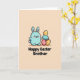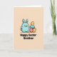 Designed with a soft pastel look, this card features a plump, stylized bunny in pale blue with oversized upright ears edged in a darker shade, a tiny white puff tail, and wide dark eyes with rosy cheeks and a little tongue peeking out 🐰. The bunny sits on the left side, angled toward a neat stack of four decorated oval eggs, as if sharing a shy, friendly glance with them. The eggs are piled to the right in bright spring colors: sunny yellow with thin white stripes, turquoise with zigzag lines, coral pink with wavy bands, and another yellow egg with thicker contrasting stripes 🌷. Everything rests against a warm beige background that keeps the scene simple and airy. Beneath the illustration, the greeting “Happy Easter Brother” appears centered in black sans-serif lettering, giving the design a clear focal line of text. The gentle lighting and rounded shapes make the bunny’s expression feel affectionate, like it’s presenting the eggs to someone it cares about. The four eggs form a tidy vertical stack with crisp patterns, sitting just to the right of the bunny’s nose.