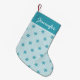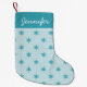 Cute Christmas stocking featuring your name in a white, script font with a turquoise blue background. The stocking features a pattern of turquoise blue snowflakes with white snow. The snowflake patterned Christmas stocking is perfect for kids, pets, and adults!