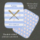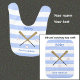 This double-sided burp cloth has a design featuring crossed baseball bats with three baseballs, and is ready for you to personalize with your baby's name. The accompanying caption is simply "Future baseball star" or you can customize this too. The background has broad stripes in colors of pale blue and white. On the back is a repeating geometric pattern of baseballs on a light blue background.