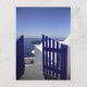 Photograph of a blue gate with a view out to sea, Santorini, Greece