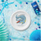 Cute alligator theme birthday party paper plate featuring an illustration of a blue crocodile with a party hat with the hand lettered text "Chomp, chomp" Perfect for a boy's party in the summer.