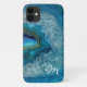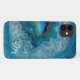 Classy iPhone 11 case, with graphics of a aqua blue and gold geode agate pattern. Personalize the one letter monogram as a great gift idea.