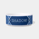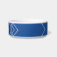 Unique pet bowl design in navy blue, white, and royal blue with overlapping geometric lines and squares with a cat or dog's name printed in the middle of the front of a white ceramic food or water bowl. DESIGNER TIP: All colors and fonts are editable so you can design your own creative bowl as a work of art that matches your decor!