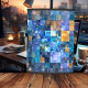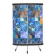 An artistic design lamp featuring a geometric mosaic pattern in fresh blue purple colors with a variety of additional colors.