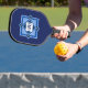 This pickle ball paddle has a contemporary geometric design, in shades of blue. The front design is made up, of blue squares that overlap each other. In the center there is an area for a monogram. On the back of the paddle there is a repeating patter of the design on the front.