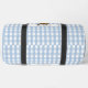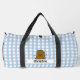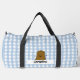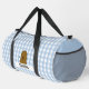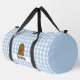Adorable duffle bag featuring a cute happy cartoon brown potato. The background is a cute classic pattern of blue and white gingham. A template below the potato to add your name.