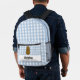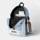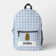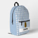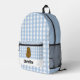 Adorable backpack featuring a cute happy cartoon brown potato. The background is a cute classic pattern of blue and white gingham. A template below the potato to add your name.