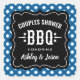 Charming wedding couples shower favor stickers featuring bold "Couples Shower BBQ" text inside a decorative black label frame with a blue and white gingham tablecloth border. Ideal as favor bag seals or envelope stickers for a casual backyard barbecue bridal shower celebration. All text is fully customizable with the couple's names and event details.