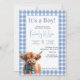 Blue gingham highland cow baby shower invitation