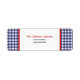 An address label featuring a blue gingham background with red trim. Personalize with your name and address. Look for matching baby shower invites and more at Jill's Paperie.