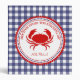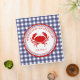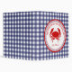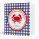 A binder featuring an image of a crab inside a red, white and blue decorative circle with text "Recipes From The Kitchen Of" Personalize with your name in red. Background is blue gingham