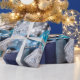 Beautiful blue and silver ornaments, ribbons, and wrapped gifts.