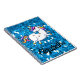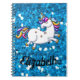 This pretty blue notebook features a chubby little unicorn, leaping for joy over a bed of blue glitter. She has golden hooves and matching gold horn, rainbow colored hair and tail, gold stars on her body, all on a sparkling blue, shiny background. Please note this cute unicorn notebook can be personalized with your own name.