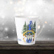 This fun Holiday latte mug has a funny little gnome holding a gold banner with green text that says "Happy Holidays!" He is dressed in blue, with a gold bell at the tip of his hat. Behind him are snow covered pine trees, and a little bird perches on the end of his long white beard. The image is printed on two sides, and your custom text is in matching blue at the center between the images.
