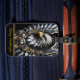 A stylized eagle with metallic silver, gold, and blue feathers, framed in an ornate circle.
