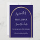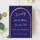 A Save the Date card for a 70th (or any age) birthday party. A dark blue background, decorated with a faux gold arch. Personalize and add a date and your name. The text: Seventy and Save the Date is written with a large trendy hand lettered style script.