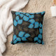 Blue gold broad leaves pattern on black throw pillow, displaying a pattern of beautiful broad leaves in blue and gold on black background.