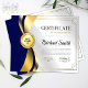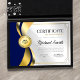 This certificate of achievement award template features blue, shiny gold & grey color tones, clean and modern style, and a gold border frame. Customize to your liking.