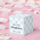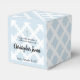 Presentation really is everything! This adorable baptism cube-shaped, favor box with circle patterns, a faux gold cross can be easily personalization with your baby boy's name and event date. The blue is soft and modern. Customize the messaging as needed.