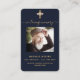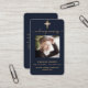 Dark blue background, a faux gold cross and space for your photo. Personalize and add name, dates and your text and prayer. Golden text.