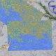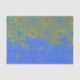 Vintage tissue paper design featuring a blue and gold distressed damask pattern on a canvas textured background.