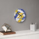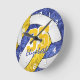 This team colors volleyball themed wall clock features the stylized, realistic image of a volleyball that has blue, gold and white panels with overlying clock face numerals - an artsy, floral kaleidoscopic pattern is blended with the volleyball's blue and gold panels - customize with the athlete's name in an autograph style font and jersey number in a varsity letter style font - by katz_d_zynes