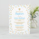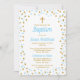 Plain white envelopes are included with paper invitations and will come to fit the invitation size you select. If you don’t need the envelopes, you may choose to not receive them by selecting the dropdown below "Envelopes" and choosing "None." If you’d like to have a design on your envelopes, you can browse all of these available envelopes to find the design that complements your Blue Gold Glitter Confetti Baptism Invitation.