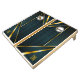 A cool luxurious style abstract corn hole set featuring blue and gold geometric design. Personalize with your custom monogram.