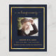 An elegant 2-page program. A dark blue background, a faux gold frame and space for your photo. Personalize and add name, dates and your text.
