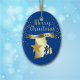 Give them something pretty from the great state of Rhode Island! On the front of this ornament is a shiny gold silhouette image of the state, with a darker gold star imposed over it. Above the state and star image is the glittery message MERRY CHRISTMAS in script, and a banner with the text in blue RHODE ISLAND. Around it all are gold snowflakes. The images and text are placed on a deep blue background. The back of the ornament has text fields in light gold for you to customize, and a second gold star image. You may change the background color, if you'd like, by choosing CUSTOMIZE.