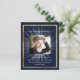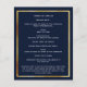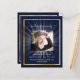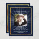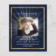 An elegant 2-page program. A dark blue background, a faux gold frame, and space for a photo. Light beams behind the photo. Personalize and add name, dates and your text.
