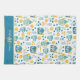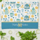 This pretty kitchen towel features a blue, gold, and white pattern of tea kettles, tea cups, and boho style flower and berry images. At one end is a matching solid blue border that holds your monogram in gold, and your name or other text in white. Cute!