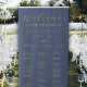 Elegant navy blue and gold vertical foldable wedding welcome sign and seating chart retractable banner with a list of your guests in alphabetical order. Design with script and serif letters to add a chic touch to your reception entrance.
