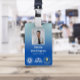 Vertical office employee badge with a simple design against a gradient from pale blue to sky blue. Add a photo of the employee along with name and profession. Personalize further with three business logos.
